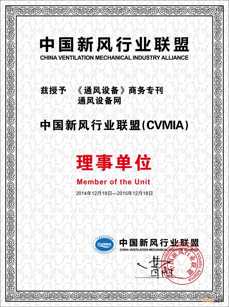 《通風(fēng)設(shè)備》商務(wù)專(zhuān)刊和通風(fēng)設(shè)備網(wǎng)榮為中國(guó)新風(fēng)行業(yè)聯(lián)盟理事單位證書(shū)