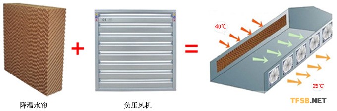 環(huán)??照{(diào)濕簾風(fēng)機(jī)(也稱濕膜式)加濕系統(tǒng)的主要組成部分是濕膜,其材料是由植物纖維或玻璃纖維加入特殊化學(xué)原料制成,具有良好的吸濕性和濕挺性.濕膜具有特殊的形狀,通過設(shè)計(jì)特殊的波紋角度和交叉結(jié)構(gòu),為空氣和水之間提供了巨大的接觸面積.當(dāng)水均勻地淋到濕簾層面最充分的接觸,從而達(dá)到最大的水分蒸發(fā)量.水汽隨風(fēng)帶走送入需加濕的空間,達(dá)到加濕的目的.同時(shí)水蒸發(fā),并吸收空氣的潛熱,從而達(dá)到降溫的目的.