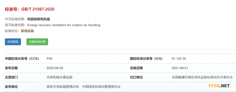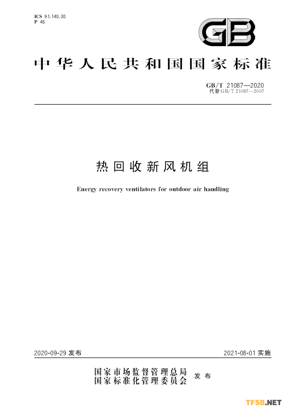 GB/T 21087-2020《熱回收新風機組》標準發(fā)布,2021年8月1日實施