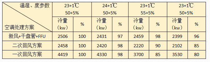 眾所周知,潔凈室對(duì)室內(nèi)的環(huán)境要求較高 ,對(duì)溫度 、濕度等的要求較精確 ,有時(shí)為保證潔凈室內(nèi)的要求,空調(diào)系統(tǒng)的控制參數(shù)設(shè)置也都是“寧高勿低 ”。本文以某潔凈室為實(shí)驗(yàn)對(duì)象,其溫度要求為23+1℃,相對(duì)濕度要求為50+5%,在生產(chǎn)工藝允許的條件下,將潔凈室內(nèi)的溫度控制要求相應(yīng)放寬1℃,相對(duì)濕度放寬 5%,設(shè)置不同的參數(shù)系統(tǒng),根據(jù)數(shù)據(jù)進(jìn)行計(jì)算,見(jiàn)下表。