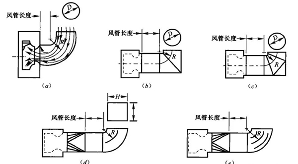 實際工程中很難達到有效風管長度,為了減少風管中渦流產(chǎn)生的局部阻力損失,設(shè)計時應(yīng)注意離心風機出口彎頭方向與風機旋轉(zhuǎn)方向一致;矩形風管采取內(nèi)外同心弧形彎頭時,彎頭的曲率半徑宜大于或等于風機出口擴大后主風管平面邊長的1.5倍。當平面邊長大于500mm,且曲率半徑小于平面邊長的1.5倍時,應(yīng)設(shè)置彎頭導流葉片,如圖所示。