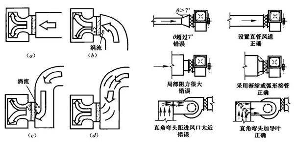 風機進口氣流產(chǎn)生偏斜和渦流是造成風量減少和壓力損失的重要原因。如果非要在風機的進口安裝彎頭,建議在風機與彎頭之間采用一段直管,而且應(yīng)采用大彎曲半徑的彎頭,如圖3-8所示。風機進口風管的錯誤連接和正確做法如圖3-9所示。