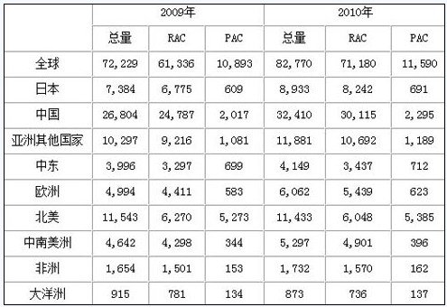 核心提示:2011年4月,日本制冷空調(diào)協(xié)會(huì)(JRAIA)公布了其對(duì)于全球房間空調(diào)器(RAC)和單元機(jī)(PAC)需求量的統(tǒng)計(jì)。RAC產(chǎn)品:即家用空調(diào)器,也稱