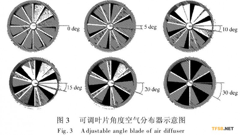 空氣分布器(風口)采用可調(diào)扇葉的螺旋型空氣分布器(風口),空氣分布器(風口)的尺寸為直徑730 mm,高度330mm,見圖2。給空氣分布器(風口)扇葉角度調(diào)整見圖3。
