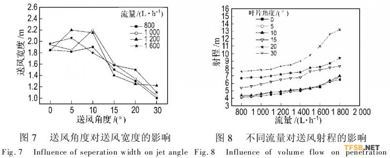 1)送風射程隨著送風風量和送風角度的增加而增大;