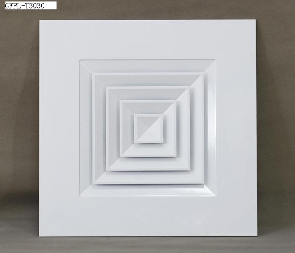方形散流器具有良好的散流特性和美觀的外形。廣泛應用于空調系統(tǒng)中作送風口,其結構形式有多樣,有1-4個不同方向散流的形式,能滿足所有類型天花板的要求。散流器外框和內(nèi)芯可分離,拆裝容易,便于調節(jié)風量。根據(jù)使用要求,散流器后端可配置風量調節(jié)閥(OBD)。