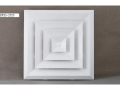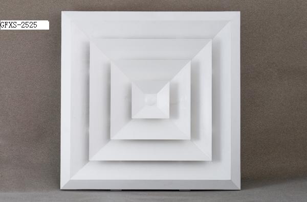 方形散流器具有良好的散流特性和美觀的外形。廣泛應用于空調系統(tǒng)中作送風口,其結構形式有多樣,有1-4個不同方向散流的形式,能滿足所有類型天花板的要求。散流器外框和內芯可分離,拆裝容易,便于調節(jié)風量。根據(jù)使用要求,散流器后端可配置風量調節(jié)閥(OBD)。