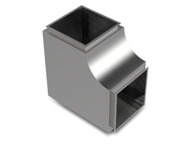 本消聲彎頭采用外角內(nèi)圓結(jié)構(gòu),有利于提高消聲效果,減小阻力損失,降低再生噪音,外殼采用鋼板( 或鍍鋅板),吸聲材料為玻璃布包超細(xì)玻璃棉,并以木框或鋼框作龍骨,保證吸聲材料在高速氣流下的穩(wěn)定性。